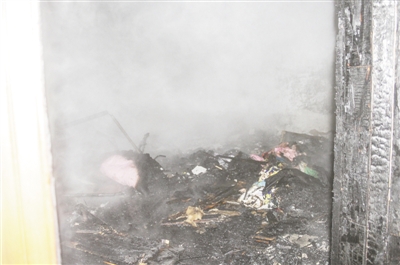 經(jīng)過40分鐘,大火最終被撲滅,但失火臥室內(nèi)的擺設(shè)已化為灰燼。房間內(nèi)一片狼藉,墻壁被熏得烏黑,臥室的門也被燒焦,大火已經(jīng)蔓延到了走廊,但由于撲救及時,才沒有釀成更大損失。