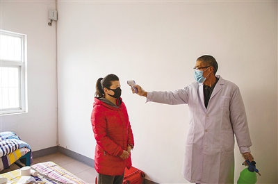 3月2日下午,在漯河市救助站二樓女區(qū),吃過午飯,余旺梅像往常一樣在房間內休息,看手機上關于疫情進展情況,然后測量體溫。余旺梅是一名月嫂,有時候,她還會看看書,或者練習一下按摩手法,為以后找工作做準備。