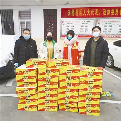 2月6日,志愿者楊英偉(左二)自費(fèi)購(gòu)買(mǎi)100箱方便面,分別送給召陵區(qū)東城街道辦事處、天橋街道辦事處和召陵區(qū)政協(xié)防疫值班點(diǎn)。記者 朱 紅 攝