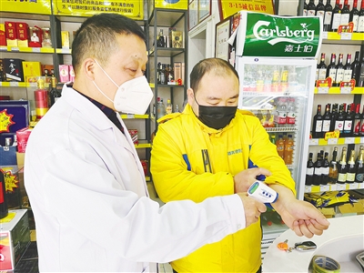 王黎明所在的社區(qū)有5平方公里,居民將近1萬人,最近復(fù)工復(fù)業(yè)的店鋪有百十家, 他每天都要把這些店鋪?zhàn)邆€(gè)遍,就像醫(yī)院里的醫(yī)生“查房”一樣,給店鋪的員工測(cè)量體溫,了解他們的身體健康狀況,然后做好登記。同時(shí),他還要指導(dǎo)店鋪開展好環(huán)境消毒,給員工們講解防疫知識(shí)以及如何正確佩戴口罩。