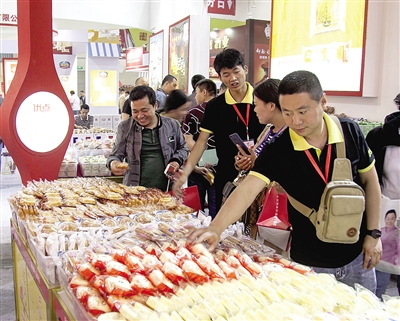 在場(chǎng)館內(nèi)的A區(qū)入口處,一個(gè)帶有濃濃中國風(fēng)的展位吸引了記者的目光。隨著一個(gè)個(gè)火紅的繡球望去,原來是“金老大老月餅”的展館。記者一進(jìn)入展館好像時(shí)光就拉回到中秋佳節(jié)。展館正中央,有一個(gè)直徑50厘米的大月餅,引來不少人圍觀。“這個(gè)月餅是我們這里最大的,可以根據(jù)顧客需要定制。想吃牛肉味的我們就做成牛肉味的,想吃五仁的就做成五仁的,只要顧客想得到,我們都可以做。”工作人員對(duì)記者介紹。