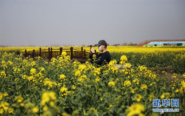 3月18日,游客在江蘇省興化市千垛景區(qū)拍照。 近日,正值江蘇省興化市千垛景區(qū)萬畝油菜花盛開期,金燦燦的油菜花在水道圍成的垛田上形成一片片金黃色的“花海”,形成了“河有萬灣多碧水,田無一垛不黃花”的壯觀景色。 新華社記者 李雨澤攝