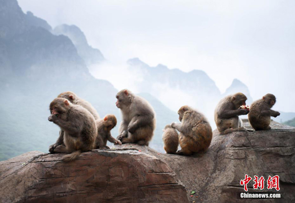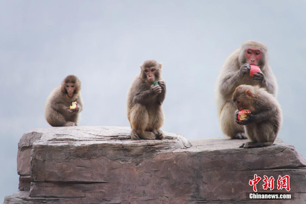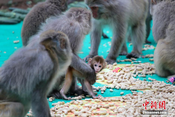 5月9日,在母親節(jié)到來之際,在位于河南濟(jì)源的太行山獼猴國(guó)家自然保護(hù)區(qū)——五龍口,工作人員為猴媽猴寶們添加營(yíng)養(yǎng)餐,祝愿它們“母子平安”,現(xiàn)場(chǎng)用獼猴最愛吃的花生等拼成中國(guó)結(jié)圖案。圖為野生獼猴在進(jìn)食。中新社記者 王中舉 攝