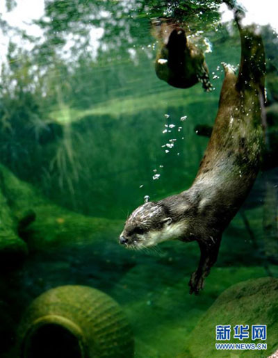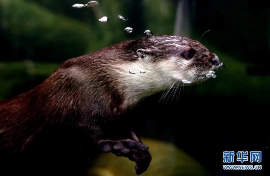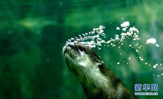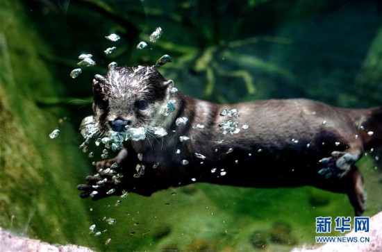 6月10日在上海動(dòng)物園拍攝的小爪水獺。 新華社記者 張建松 攝