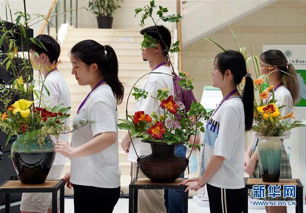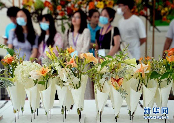 6月13日,上海應(yīng)用技術(shù)大學(xué)的學(xué)生們?cè)O(shè)計(jì)創(chuàng)作的萱草花藝作品即將在開(kāi)幕式現(xiàn)場(chǎng)亮相。 當(dāng)日,“2020中國(guó)(上海)萱草文化節(jié)”在上海應(yīng)用技術(shù)大學(xué)開(kāi)幕,校園里數(shù)百個(gè)品種的萱草花競(jìng)相綻放,萱草科研推廣、萱草文化交流等多項(xiàng)活動(dòng)同時(shí)舉行。 新華社記者劉穎攝