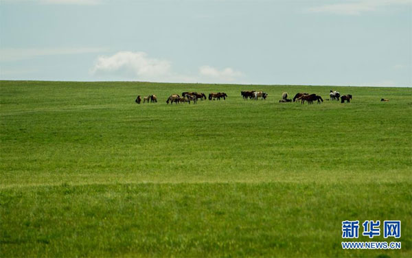 6月17日,馬兒在錫林郭勒盟烏拉蓋草原上吃草。 初夏時節(jié),內(nèi)蒙古中部的錫林郭勒大草原風景如畫。 新華社記者 連振 攝
