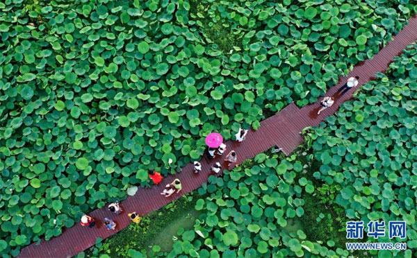 6月28日,游客在廣西柳州市柳江區(qū)百朋鎮(zhèn)萬(wàn)畝荷塘里觀賞荷花(無(wú)人機(jī)照片)。 連日來(lái),廣西柳州市柳江區(qū)百朋鎮(zhèn)萬(wàn)畝荷塘種植的春季蓮藕喜獲豐收,各色荷花競(jìng)相綻放,吸引游客前來(lái)賞玩。百朋鎮(zhèn)是柳州市柳江區(qū)雙季蓮藕的主產(chǎn)區(qū),雙季蓮藕種植面積達(dá)3.2萬(wàn)畝。同時(shí),當(dāng)?shù)胤e極發(fā)展荷花景區(qū)生態(tài)旅游休閑項(xiàng)目,260多戶貧困戶通過(guò)蓮藕種植及旅游產(chǎn)業(yè)實(shí)現(xiàn)脫貧。 新華社發(fā)(黎寒池 攝)
