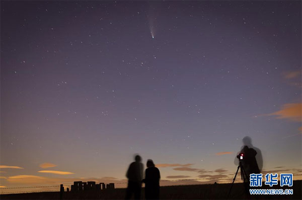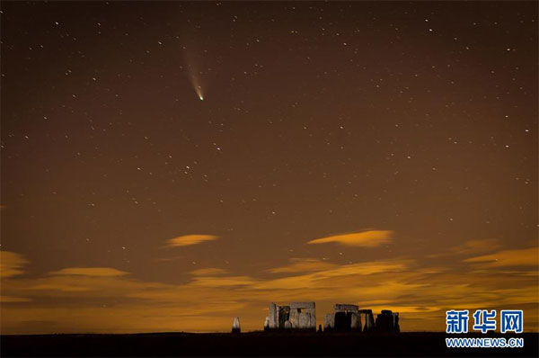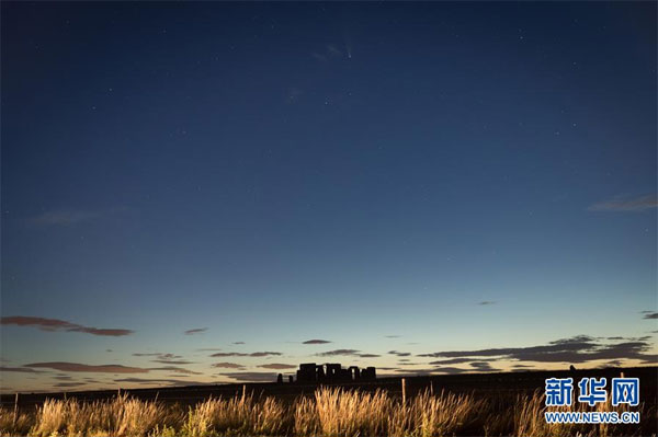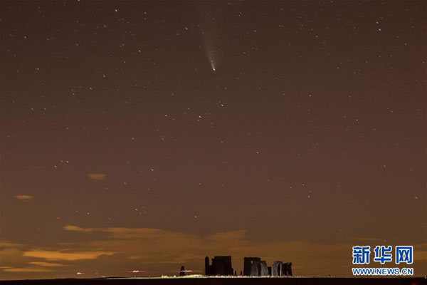 7月22日,在英國英格蘭威爾特郡的巨石陣,新智彗星劃過天際。 新智彗星是一顆長周期彗星。根據(jù)此前的觀測計算,其公轉(zhuǎn)周期為4400年。但它經(jīng)過近日點后,受太陽引力和大行星引力影響軌道發(fā)生改變,公轉(zhuǎn)周期變?yōu)?800年。 新華社發(fā)(蒂姆·愛爾蘭攝)