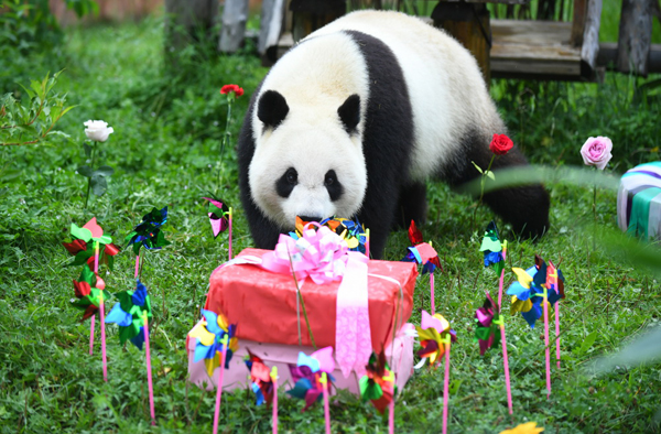7月30日,大熊貓“牧云”準(zhǔn)備拆開工作人員為它準(zhǔn)備的生日禮物。