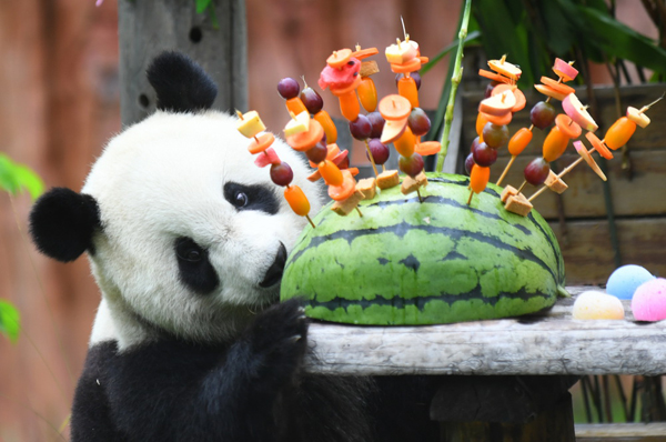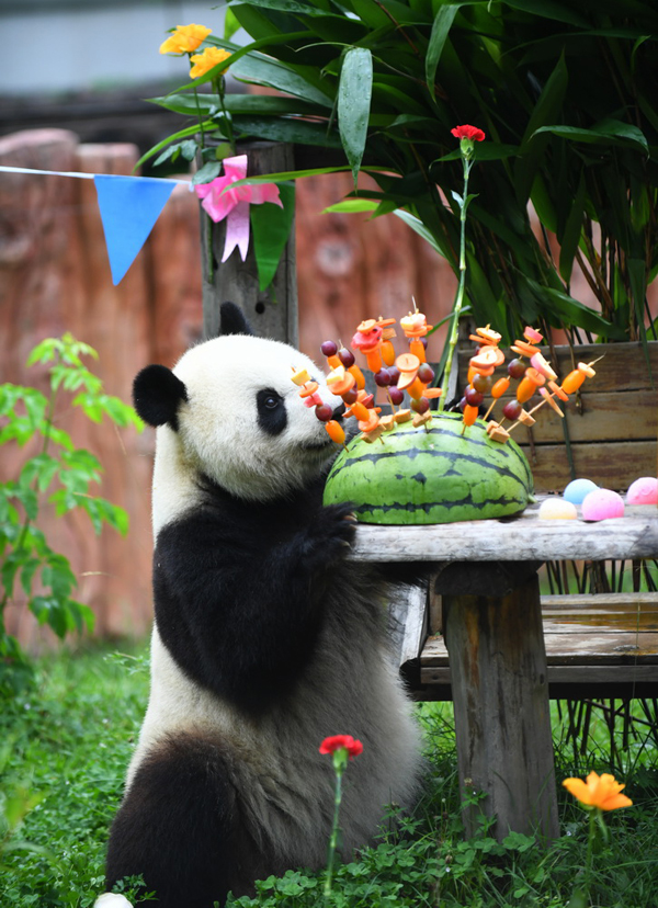7月30日,大熊貓“初心”準(zhǔn)備享用生日禮物