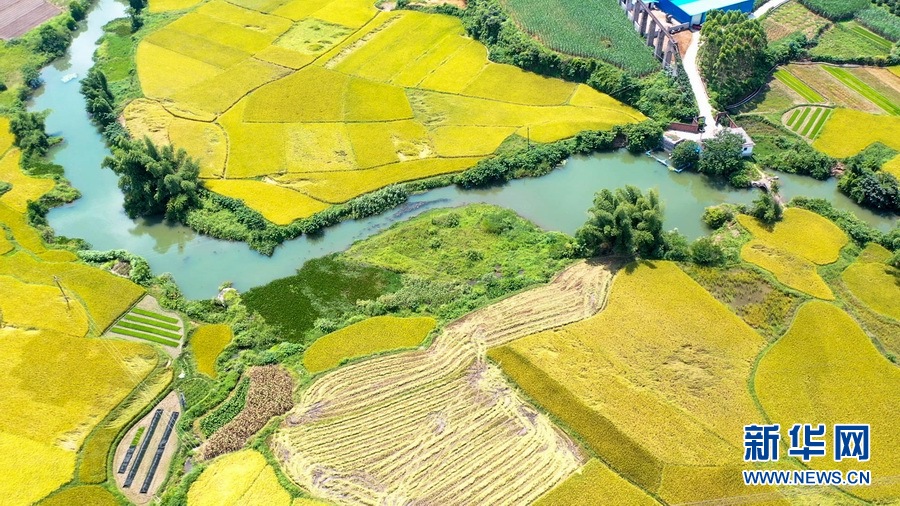 成片的早稻在陽光下金光燦燦。(無人機拍攝)