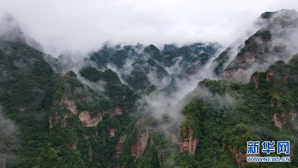 8月15日拍攝的紫金山景區(qū)(無人機(jī)照片)。 當(dāng)日,位于河北省邢臺(tái)市西部太行山脈的紫金山景區(qū)云霧彌漫,美景如畫。 新華社記者 牟宇 攝