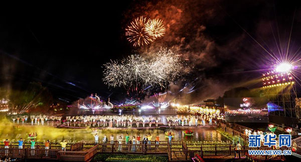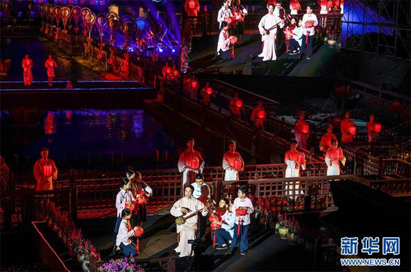 9月28日,演員在開(kāi)燈儀式上表演歌舞節(jié)目。 當(dāng)日,2020海峽兩岸(昆山)中秋燈會(huì)在江蘇昆山開(kāi)幕,為期一個(gè)月。燈會(huì)設(shè)置的水鄉(xiāng)周莊燈區(qū)以水鄉(xiāng)、古鎮(zhèn)、田園江南為依托,將傳統(tǒng)彩燈與現(xiàn)代光影藝術(shù)相融合,打造“水韻芳華”夜周莊。 新華社記者 楊磊 攝