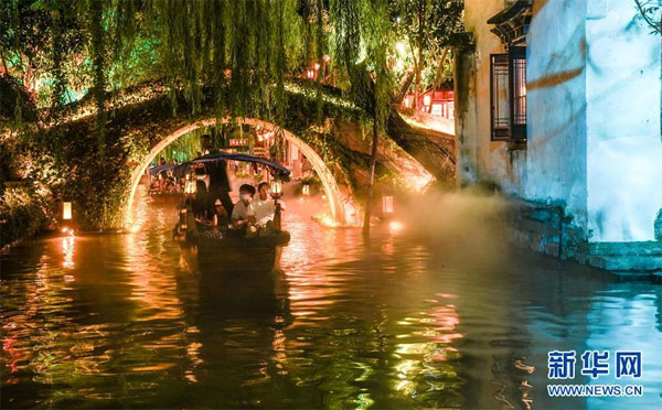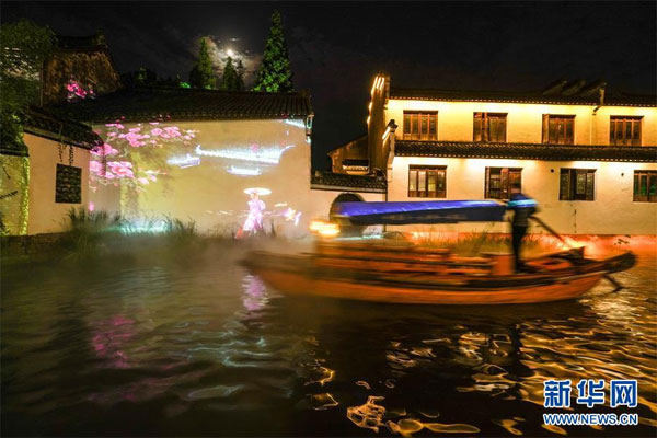 9月28日,一艘游船劃過(guò)燈光璀璨的水巷。 當(dāng)日,2020海峽兩岸(昆山)中秋燈會(huì)在江蘇昆山開(kāi)幕,為期一個(gè)月。燈會(huì)設(shè)置的水鄉(xiāng)周莊燈區(qū)以水鄉(xiāng)、古鎮(zhèn)、田園江南為依托,將傳統(tǒng)彩燈與現(xiàn)代光影藝術(shù)相融合,打造“水韻芳華”夜周莊。 新華社記者 楊磊 攝