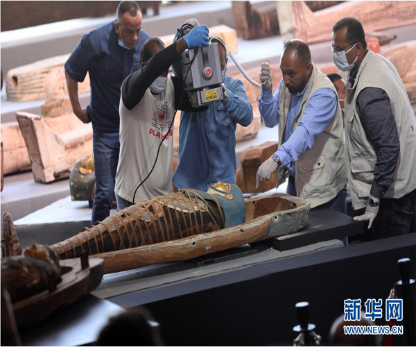 11月14日,在埃及吉薩,考古工作人員對木棺內(nèi)的木乃伊進(jìn)行X光檢查。埃及旅游和文物部長哈立德·阿納尼14日宣布,在吉薩省塞加拉地區(qū)出土100具距今約2500年的彩繪木棺,這是埃及本年度最大的考古發(fā)現(xiàn)。新華社發(fā)(艾哈邁德·戈馬攝)
