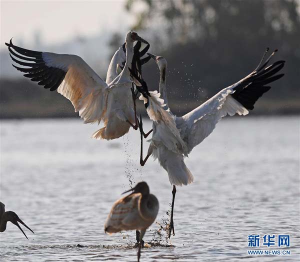 12月21日,白鶴在南昌五星白鶴保護小區(qū)的濕地中嬉戲。