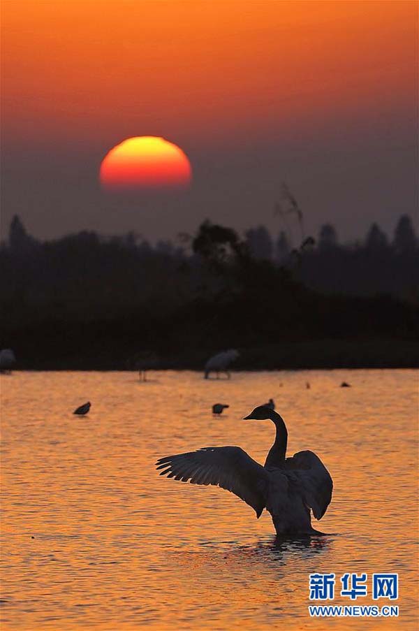12月21日,天鵝等候鳥在南昌五星白鶴保護小區(qū)的濕地中棲息。