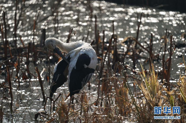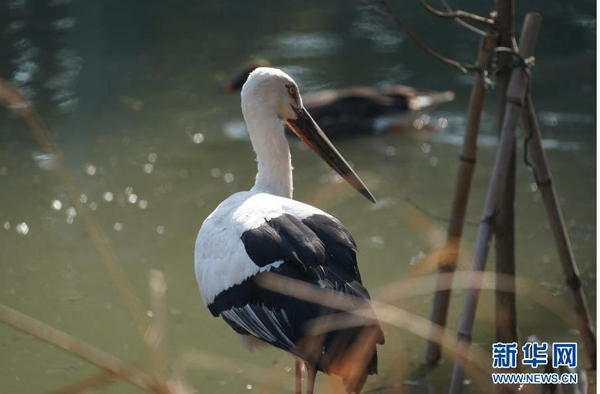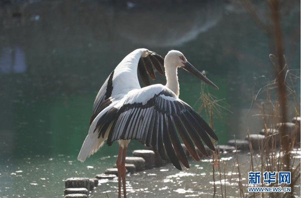 兩只受傷后被送來(lái)醫(yī)治的東方白鸛享受冬日暖陽(yáng)。受益于公眾環(huán)保意識(shí)的提升,一些意外受傷的候被人們發(fā)現(xiàn)后