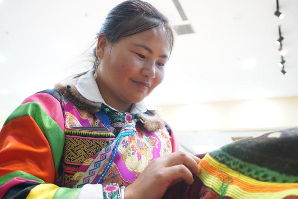 土族繡娘索英梅在繡“太陽(yáng)花”(3月5日攝)。新華社記者 央秀達(dá)珍 攝