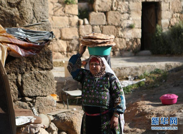 3月17日,70歲的卡茲蘭·阿布·卡巴什在約旦河西岸城市希伯倫附近的一個村莊運(yùn)送制作好的“塔本”烤餅。
