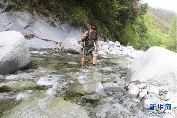 何禮文在巡護(hù)途中徒步過水(資料圖片)。新華社發(fā)