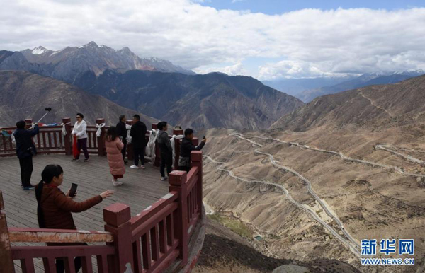 游客在觀景平臺眺望壯觀的怒江72道拐(5月3日攝)。