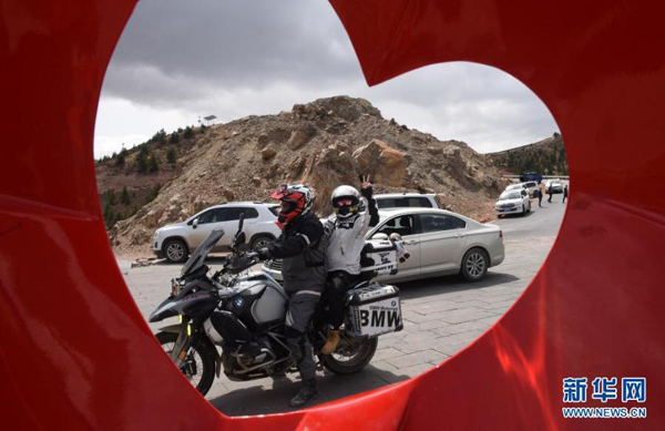 在西藏芒康縣拉烏山,一對騎行摩托的年輕人準(zhǔn)備出發(fā)(5月2日攝)。