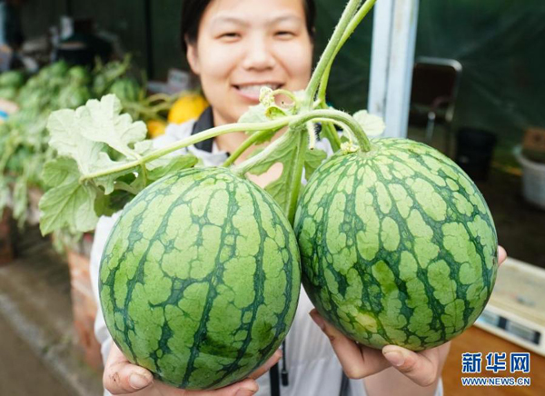 5月23日,在南京市江寧區(qū)橫溪街道,瓜農(nóng)在展示西瓜。