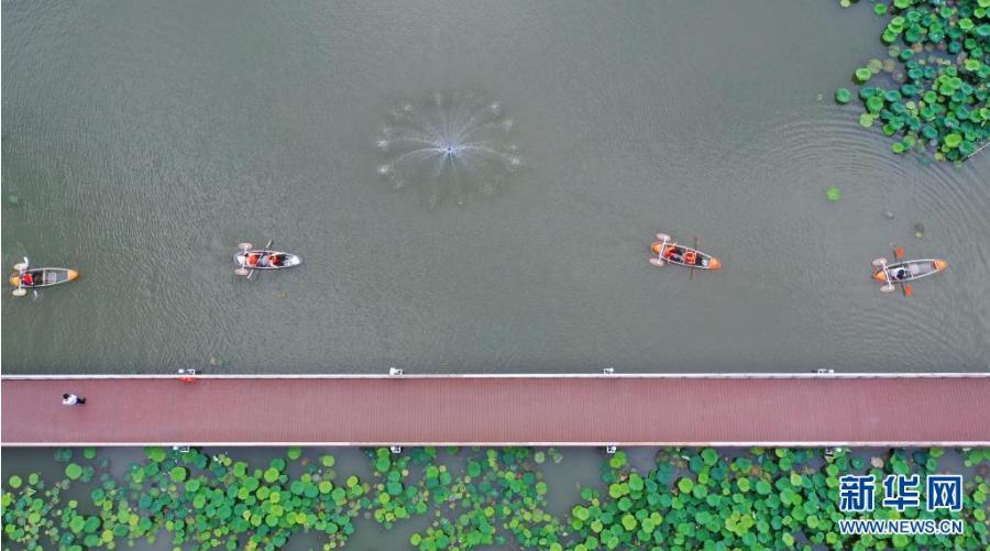 6月14日,在浙江省湖州市德清縣下渚湖國家濕地公園,游客劃船欣賞盛開的荷花(無人機(jī)照片)。