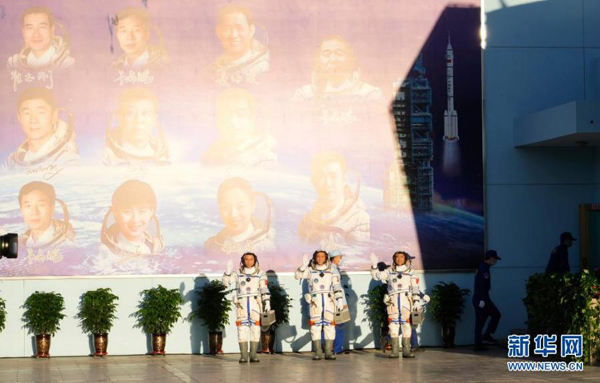 6月17日,神舟十二號航天員出征儀式在酒泉衛(wèi)星發(fā)射中心舉行。這是航天員聶海勝(中)、劉伯明(右)和湯洪波準(zhǔn)備出征。新華社記者 李剛 攝