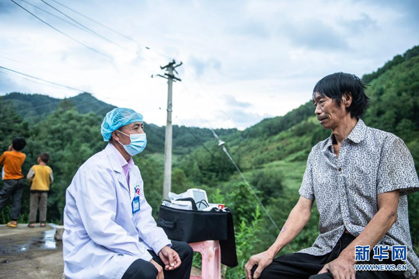 章忠武在和村民周永林交流,詢問周永林的糖尿病情況(8月16日攝)。新華社記者 陶亮 攝