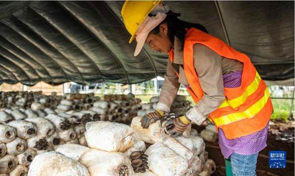 當(dāng)?shù)卮迕裨谙募移鹤庸夥l(fā)電設(shè)施下的大棚內(nèi)采摘食用菌(8月24日攝)。