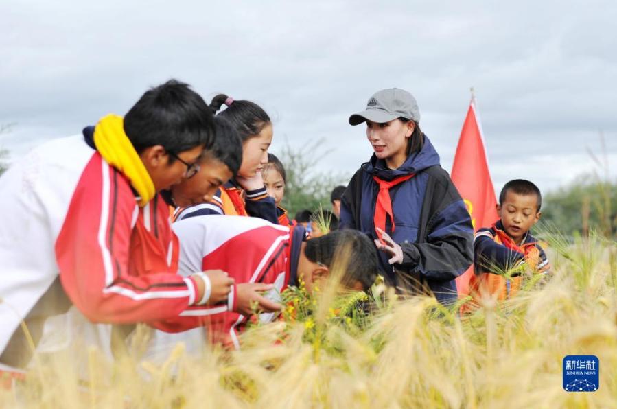 日喀則市上海實(shí)驗(yàn)學(xué)校的學(xué)生們在青稞地里聽講解(9月17日攝)。