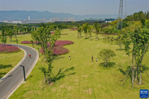 10月2日,人們在重慶市兩江新區(qū)粉黛山公園游玩(無人機(jī)照片)。