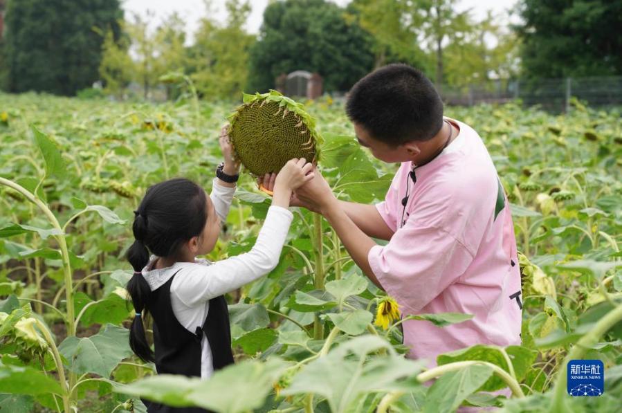 10月13日,在重慶市北碚區(qū)一個(gè)農(nóng)民創(chuàng)業(yè)園,小朋友在工作人員指導(dǎo)下體驗(yàn)采摘向日葵。