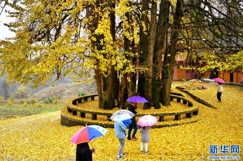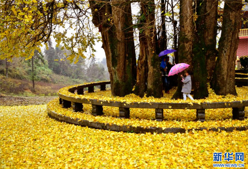 初冬時(shí)節(jié),銀杏樹葉變黃,落葉猶如給地面鋪上了一層“黃金毯”,吸引游人觀賞。 新華社發(fā)(宋文攝)