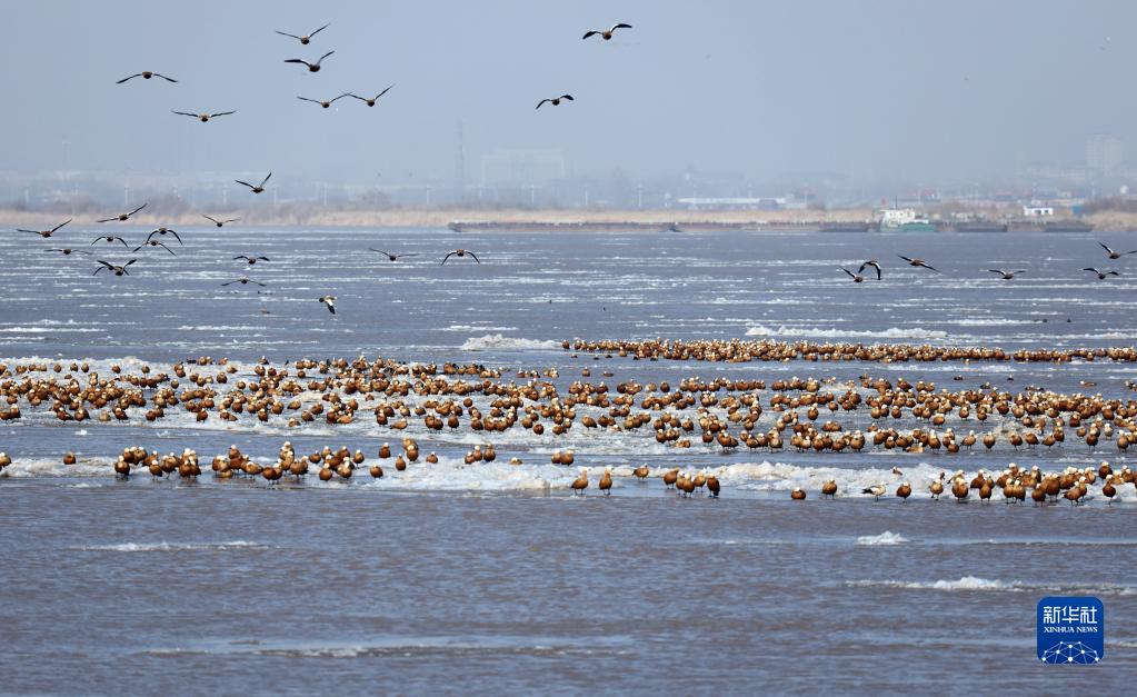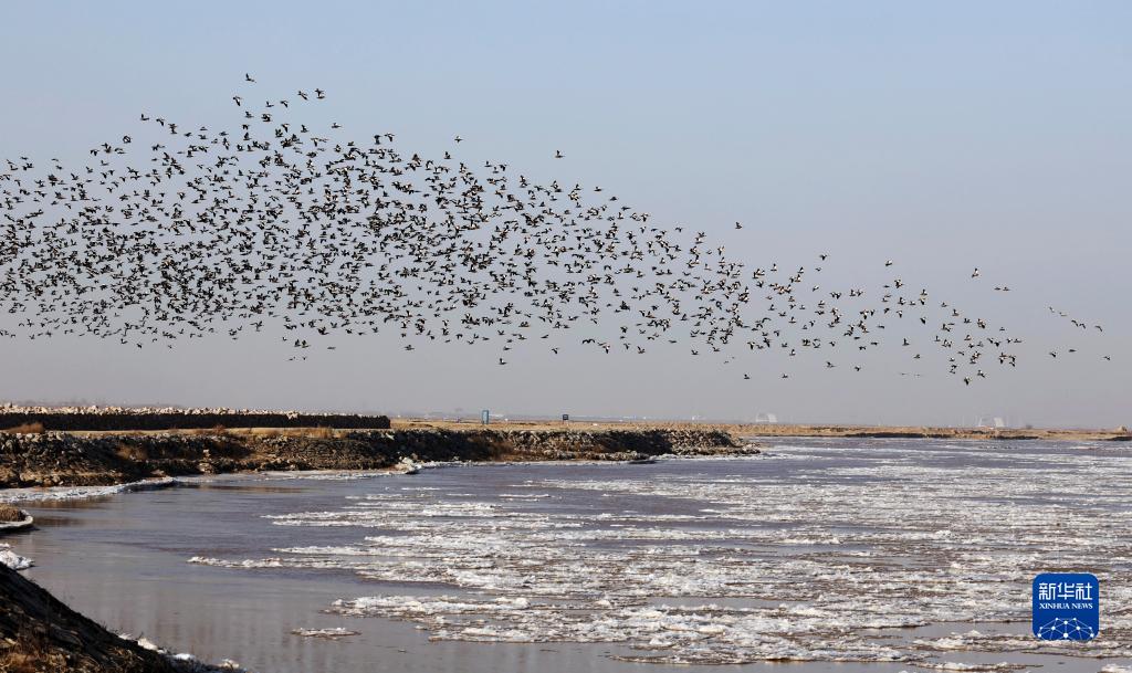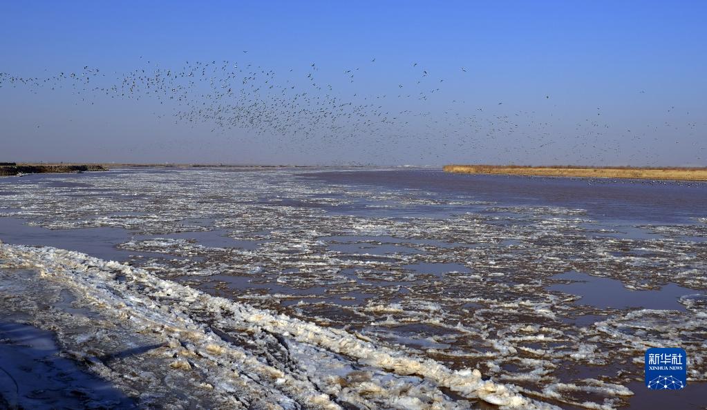 近日,受較強冷空氣影響,黃河“幾”字彎內(nèi)蒙古段出現(xiàn)流凌。大批南遷的候鳥或在空中翱翔,或在剛剛封凍的冰面上棲息,場面壯觀。