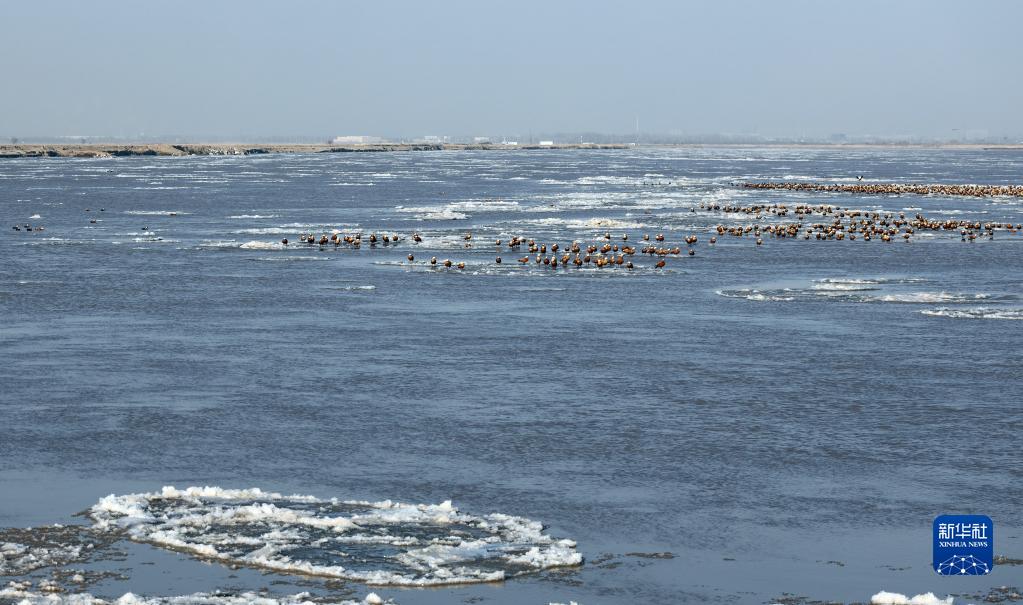 11月27日,在內(nèi)蒙古鄂爾多斯市達拉特旗,成群的候鳥棲息在剛剛封凍的冰面上。
