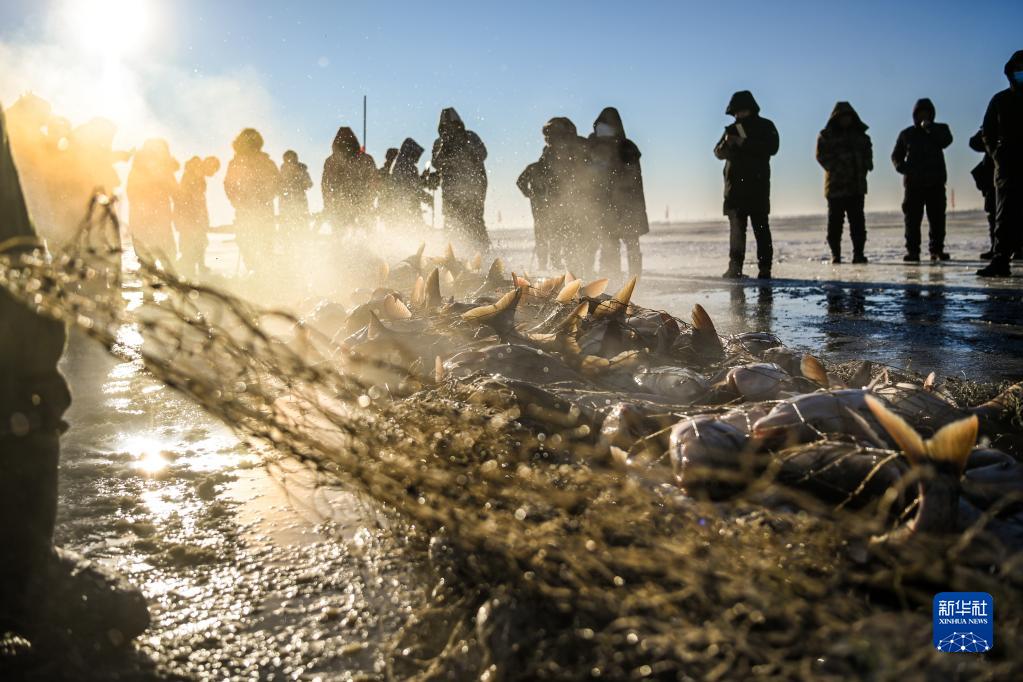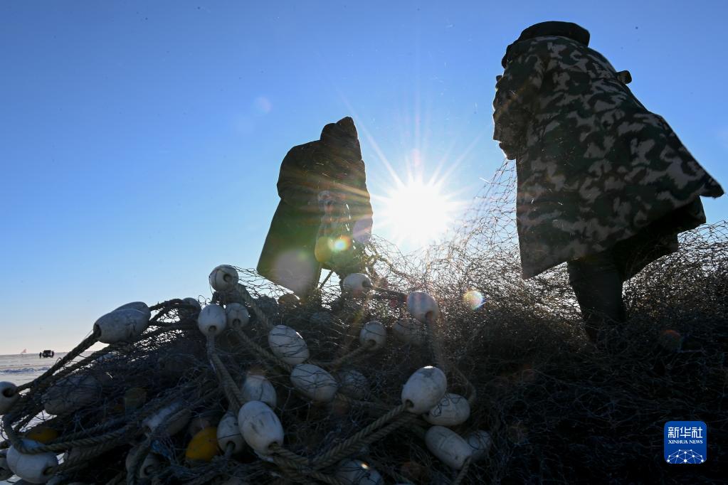 12月26日,在查干湖冰面上,漁民在做收網(wǎng)工作。