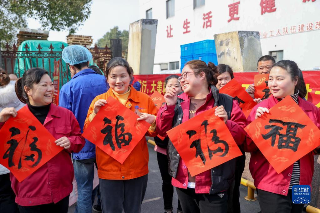 1月19日,在浙江省湖州市德清縣一塑料制品企業(yè),員工展示當(dāng)?shù)毓?huì)送來的福字。