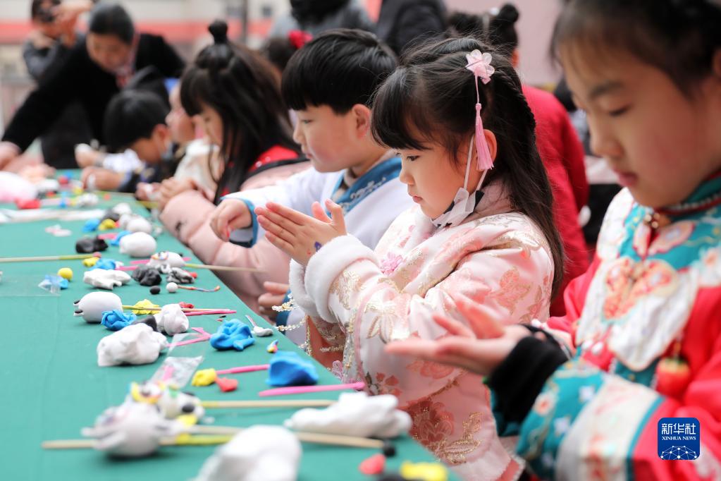 2月14日,在安徽省淮北市第三實(shí)驗(yàn)小學(xué),學(xué)生們?cè)趯W(xué)習(xí)捏面塑。