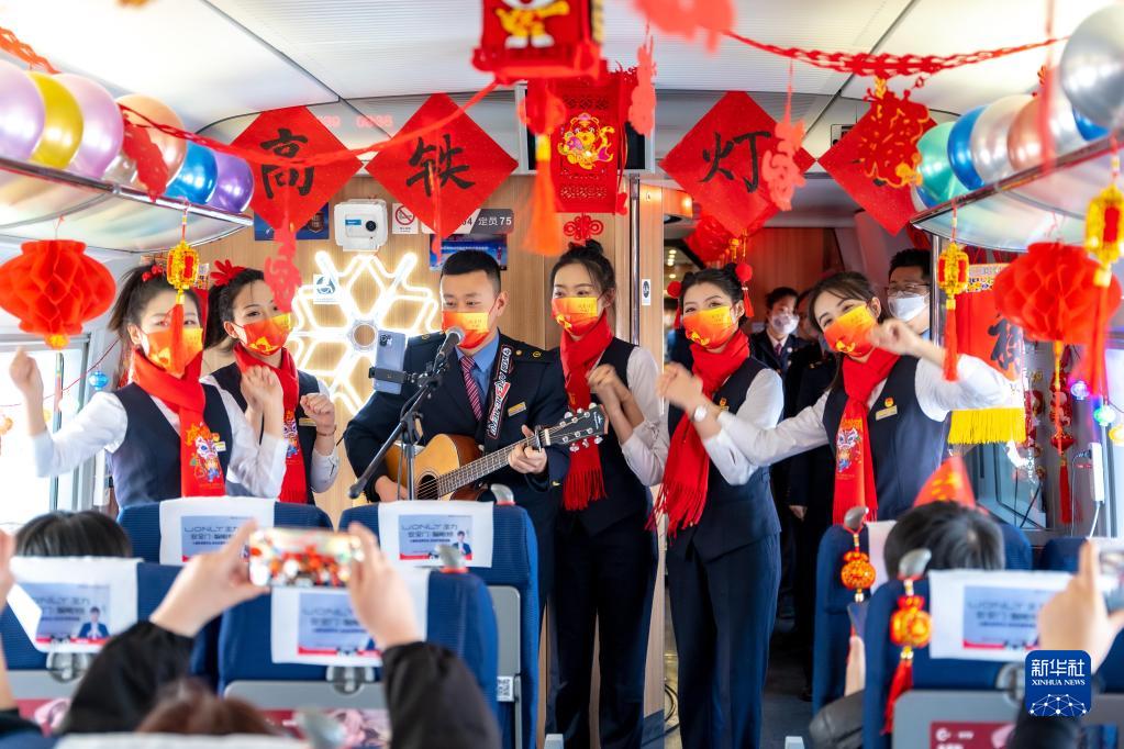 2月14日,在G8039次列車上,中國(guó)鐵路沈陽(yáng)局集團(tuán)有限公司沈陽(yáng)客運(yùn)段職工為旅客表演節(jié)目。