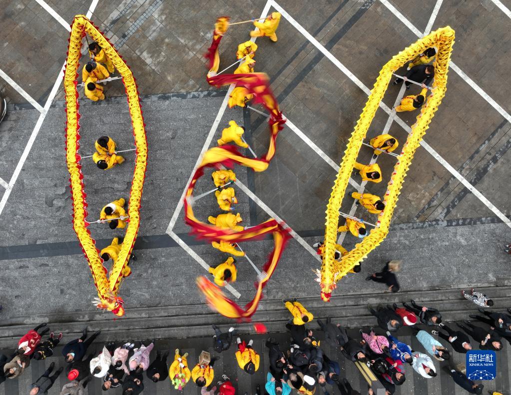 2月14日,在湖南省衡陽(yáng)市蒸湘區(qū)蒸湘街道,人們?cè)谟^看舞龍表演(無(wú)人機(jī)照片)。