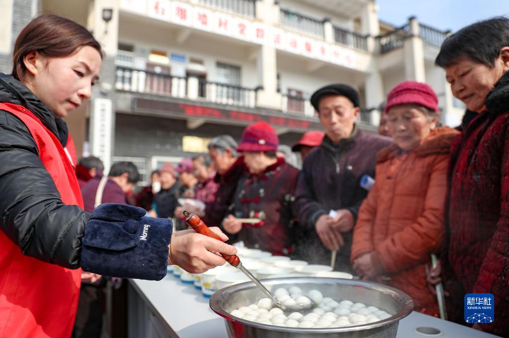 2月14日,志愿者在四川省華鎣市石堰墻村給留守老人分發(fā)湯圓。