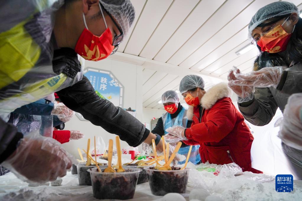 2月14日,在中建三局三公司南京華茂中心項(xiàng)目工人生活區(qū),工人們和南京市鼓樓區(qū)工人新村社區(qū)的居民一起制作湯圓。