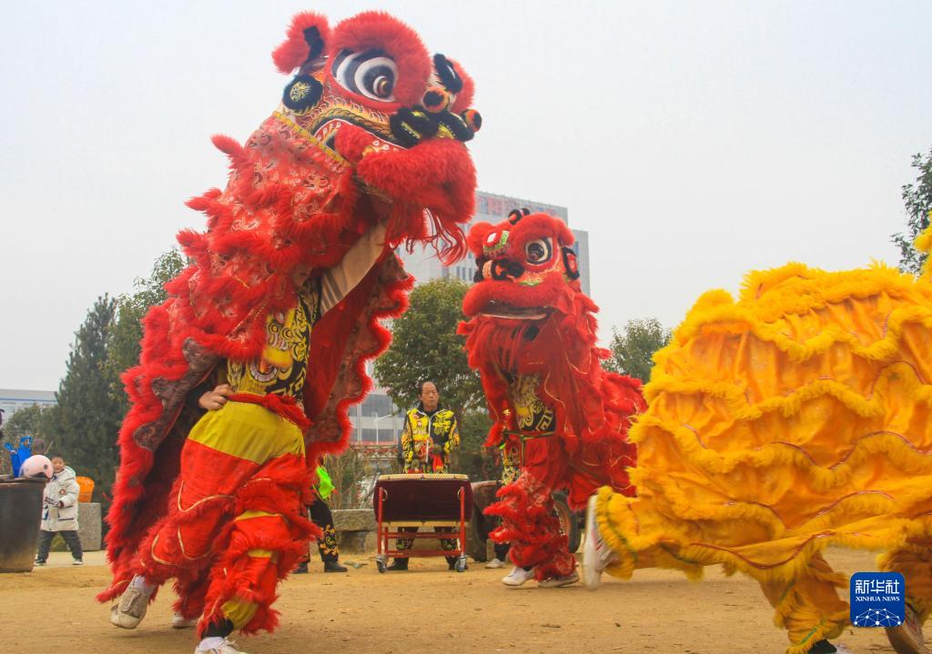 2月14日,民間藝人在河南省南陽(yáng)市高新區(qū)百里奚街道內(nèi)表演舞獅。