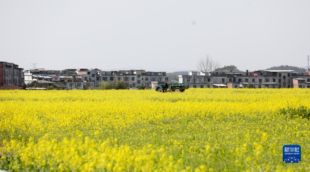 3月9日,湖南省資興市蓼江鎮(zhèn)農戶駕駛拖拉機從油菜花海中穿過。