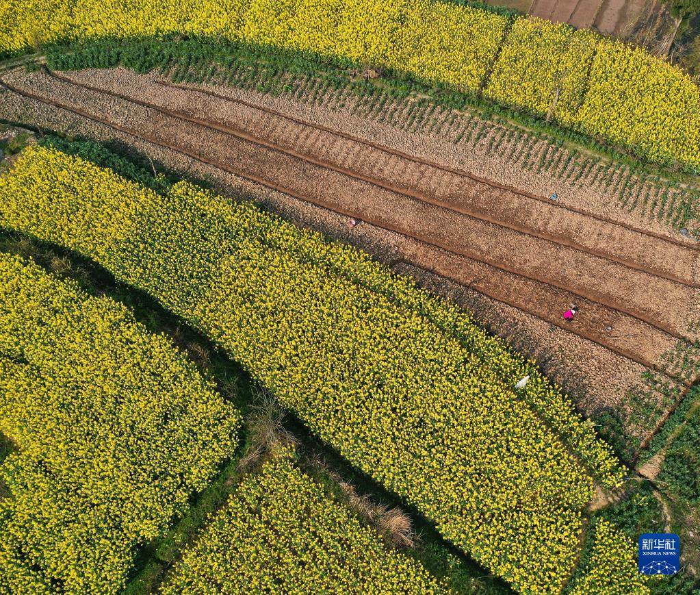 3月9日,在四川省南充市蓬安縣睦壩鎮(zhèn)武勝村,村民在田間勞作(無人機照片)。