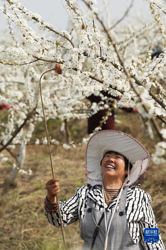 3月9日,四川省廣安市武勝縣鳴鐘鎮(zhèn)小寨村的果農給李花授粉。