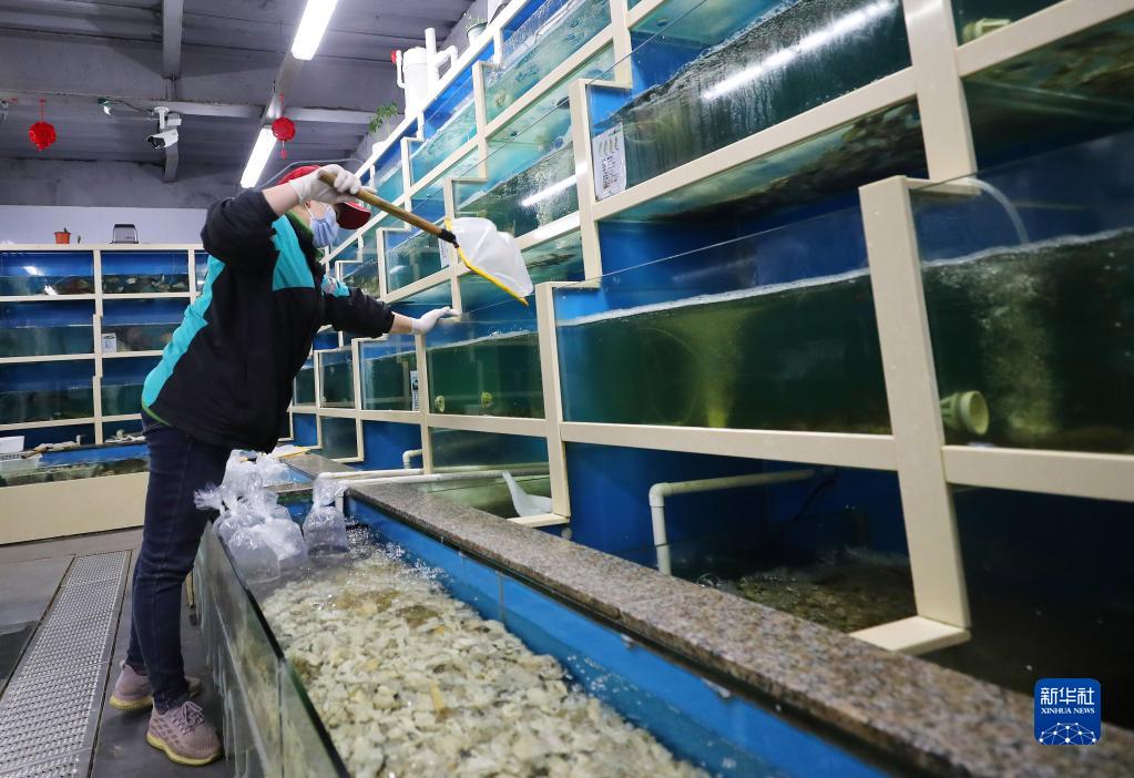 3月15日深夜,在位于上海閔行區(qū)老滬閔路的一家網絡購物平臺倉配站點,工作人員在鮮活水產品缸前清理水中雜物。